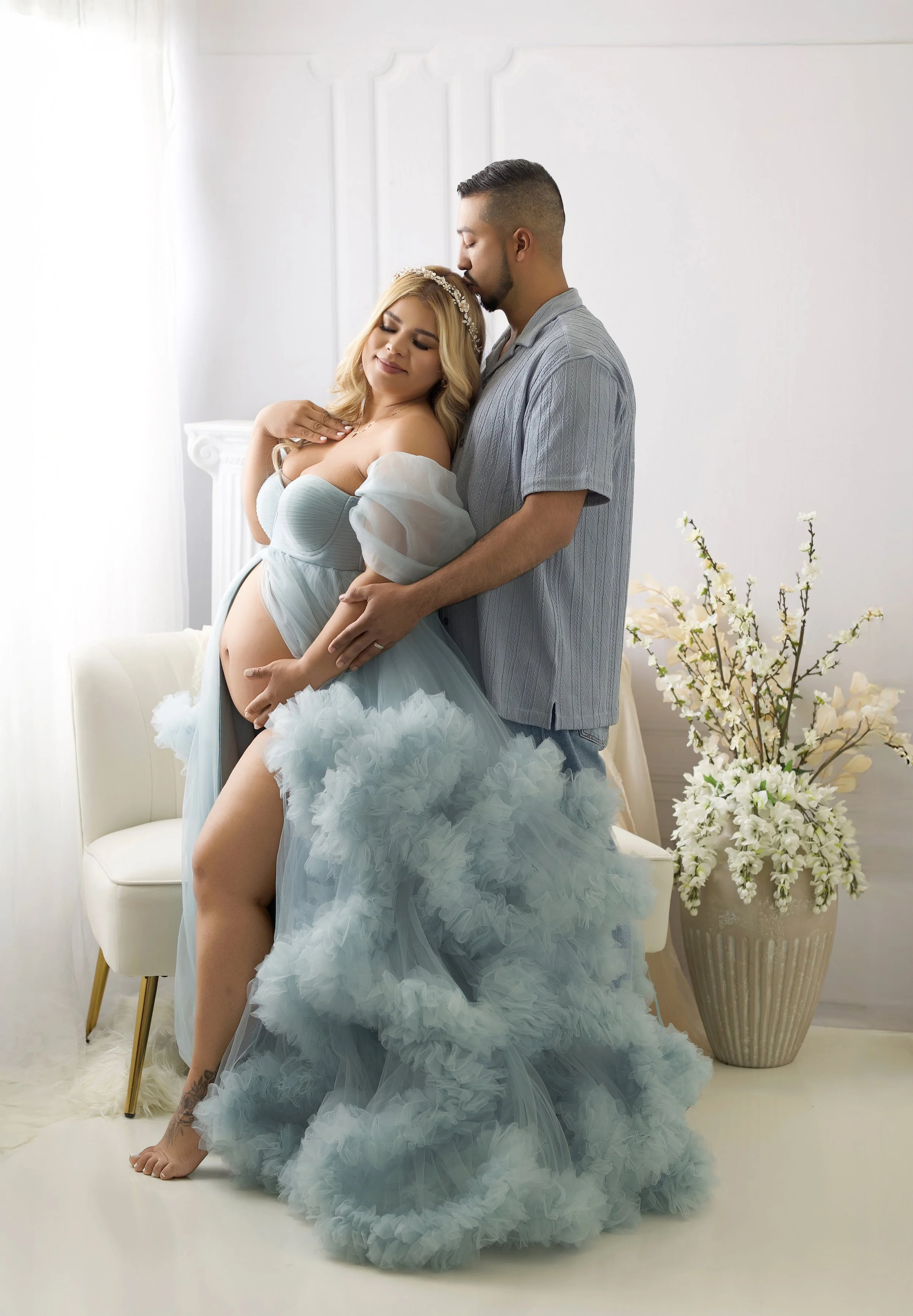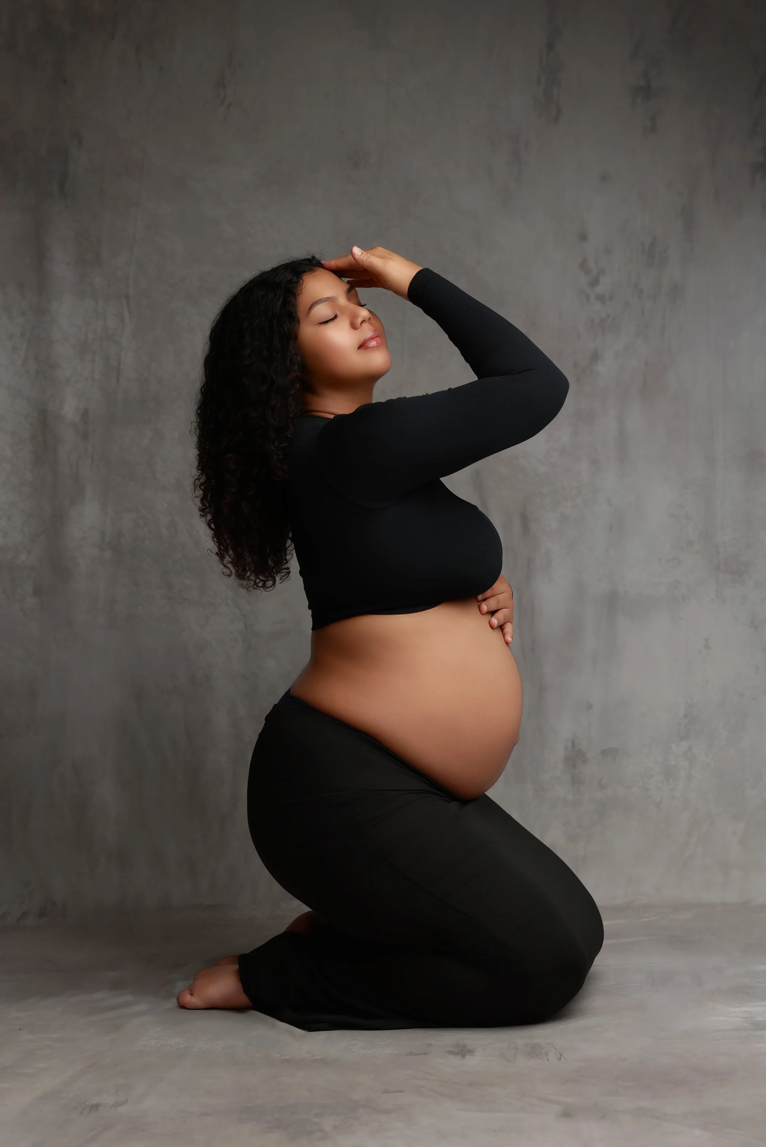 Our signature moody and modern backdrop. Featuring hand-painted textures in cool, sophisticated slate tones, this canvas is designed for the bold and the beautiful. It creates incredible, dramatic contrast, making warm skin tones glow and dark, elegant wardrobe choices pop. Perfect for a high-fashion, editorial maternity gallery.